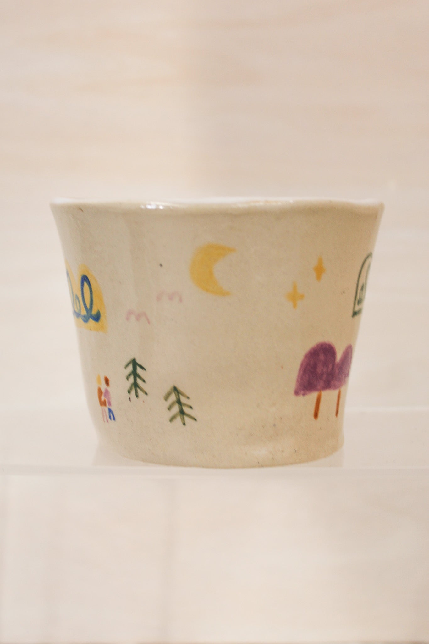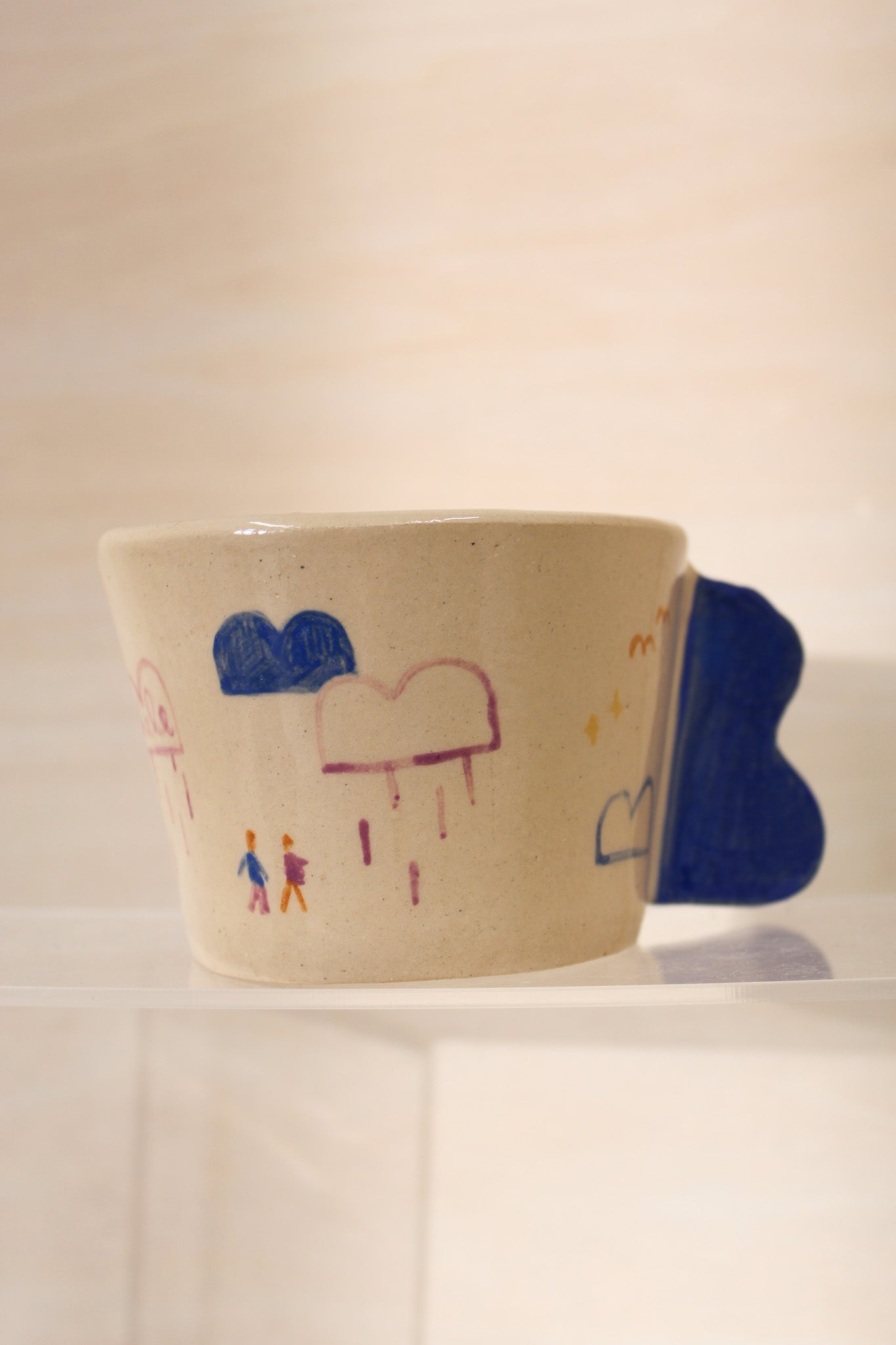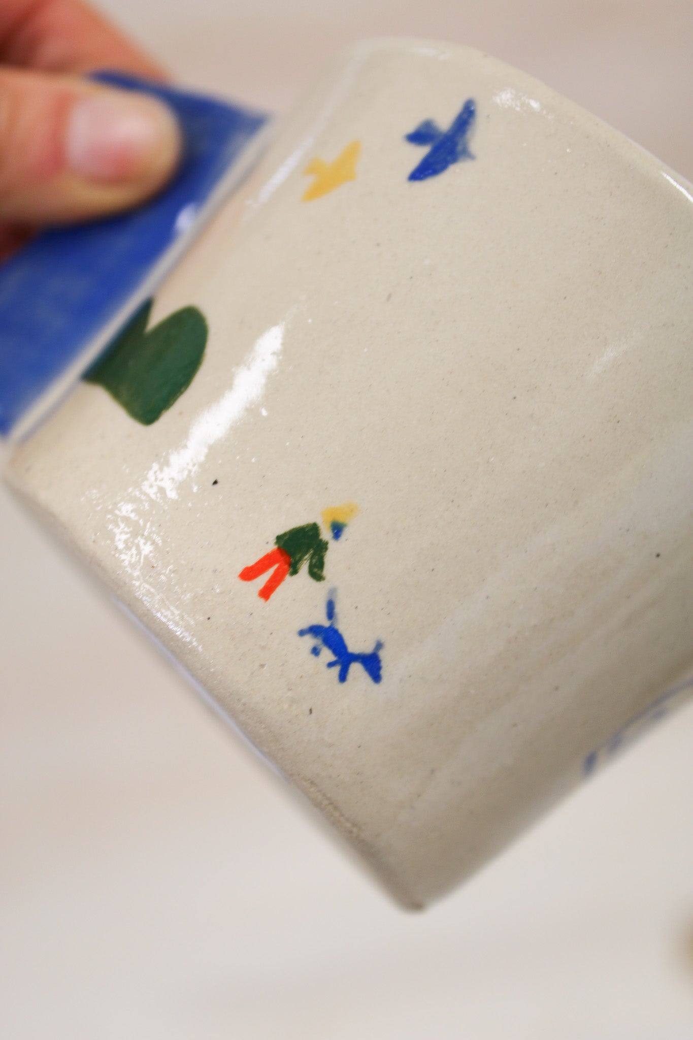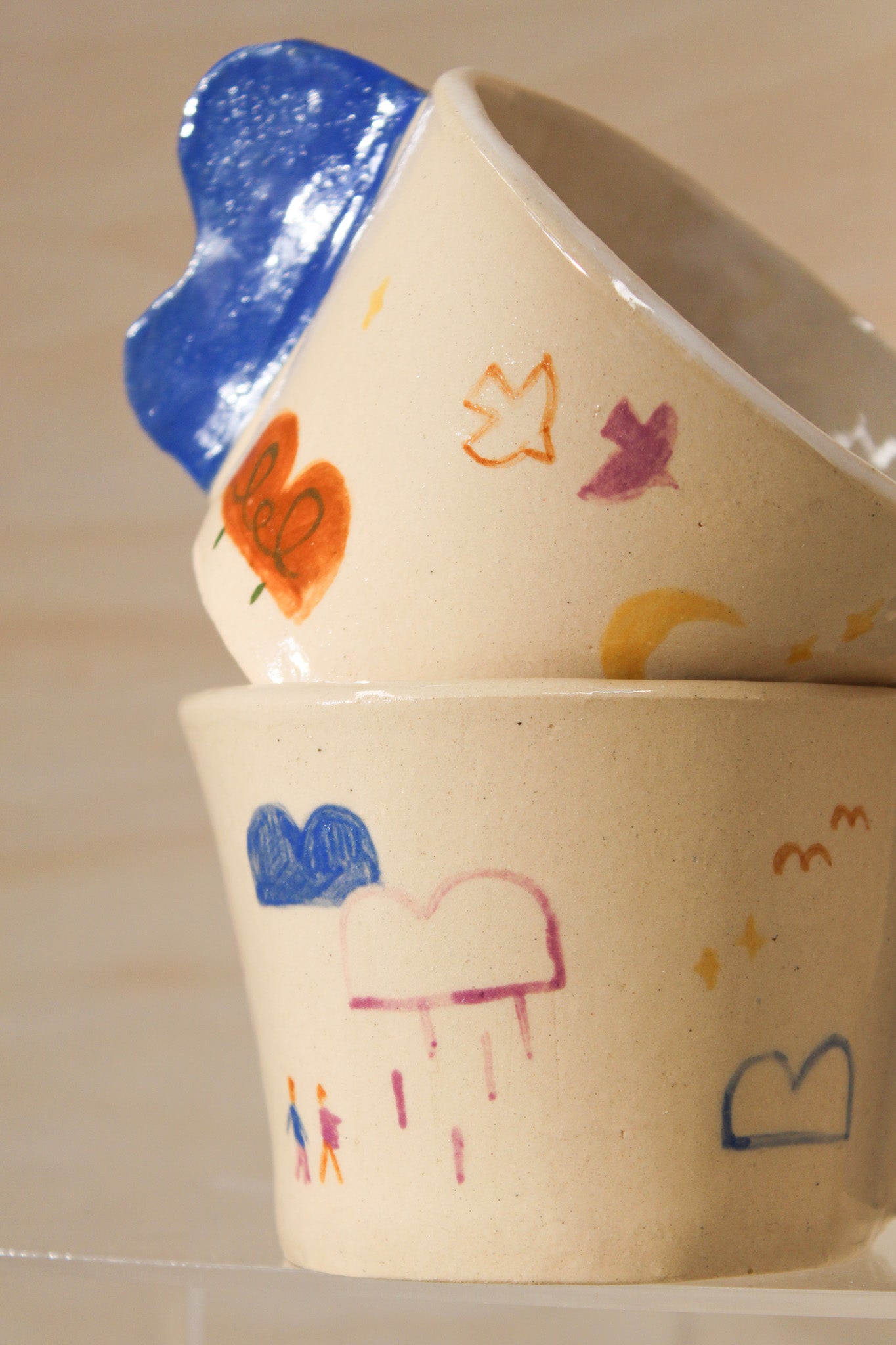 Handbemalte, in Platten-Technik gebaute Tassen, mit Henkel.
