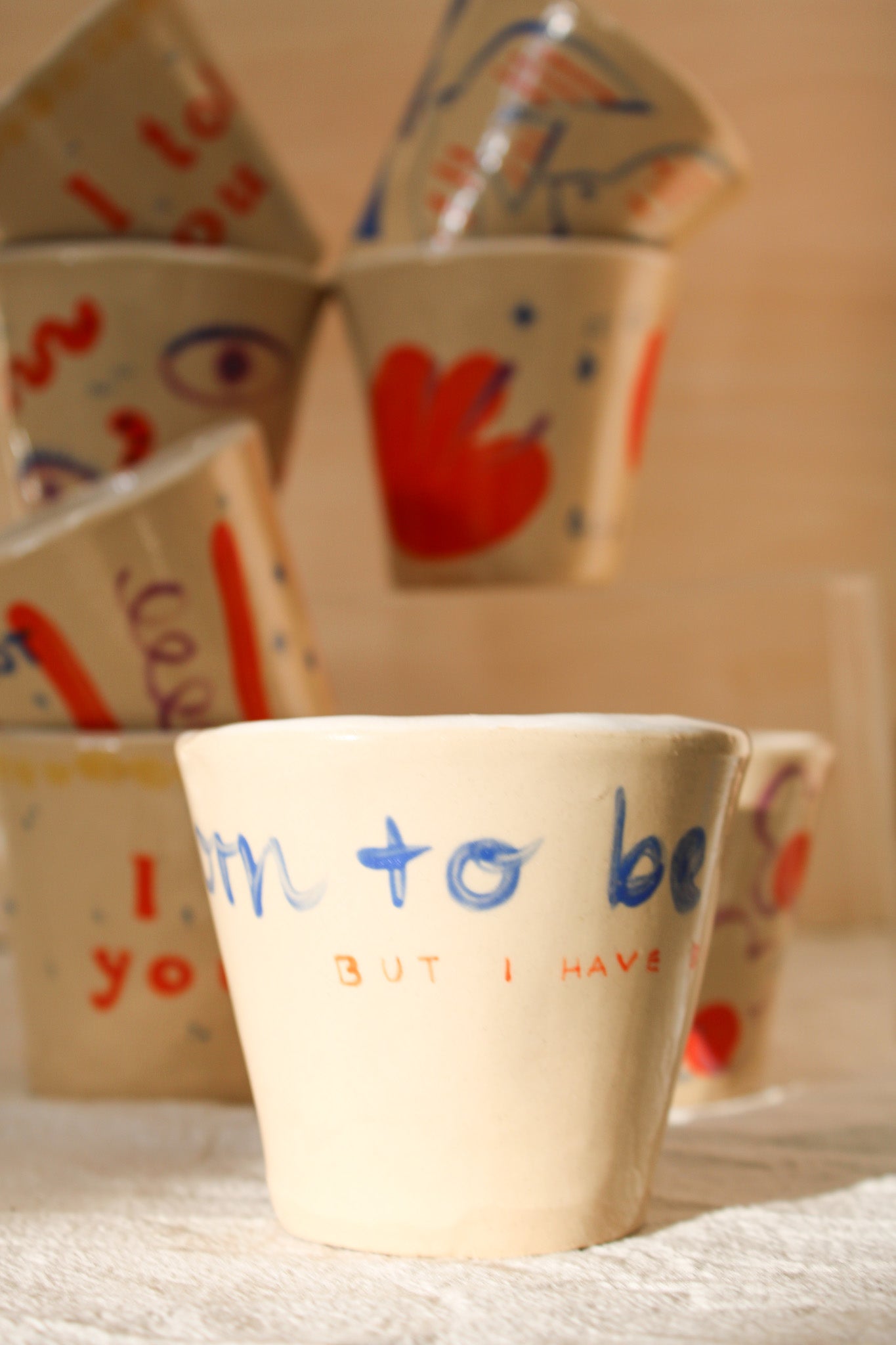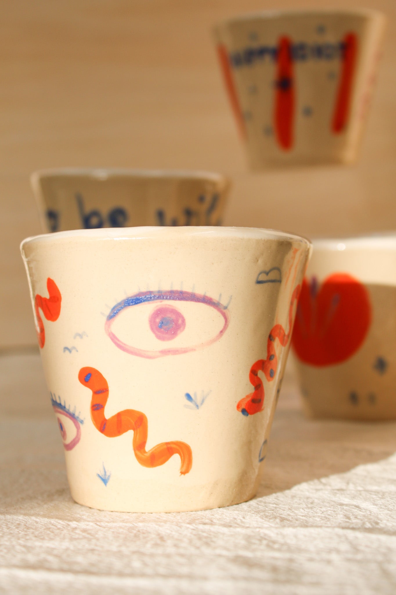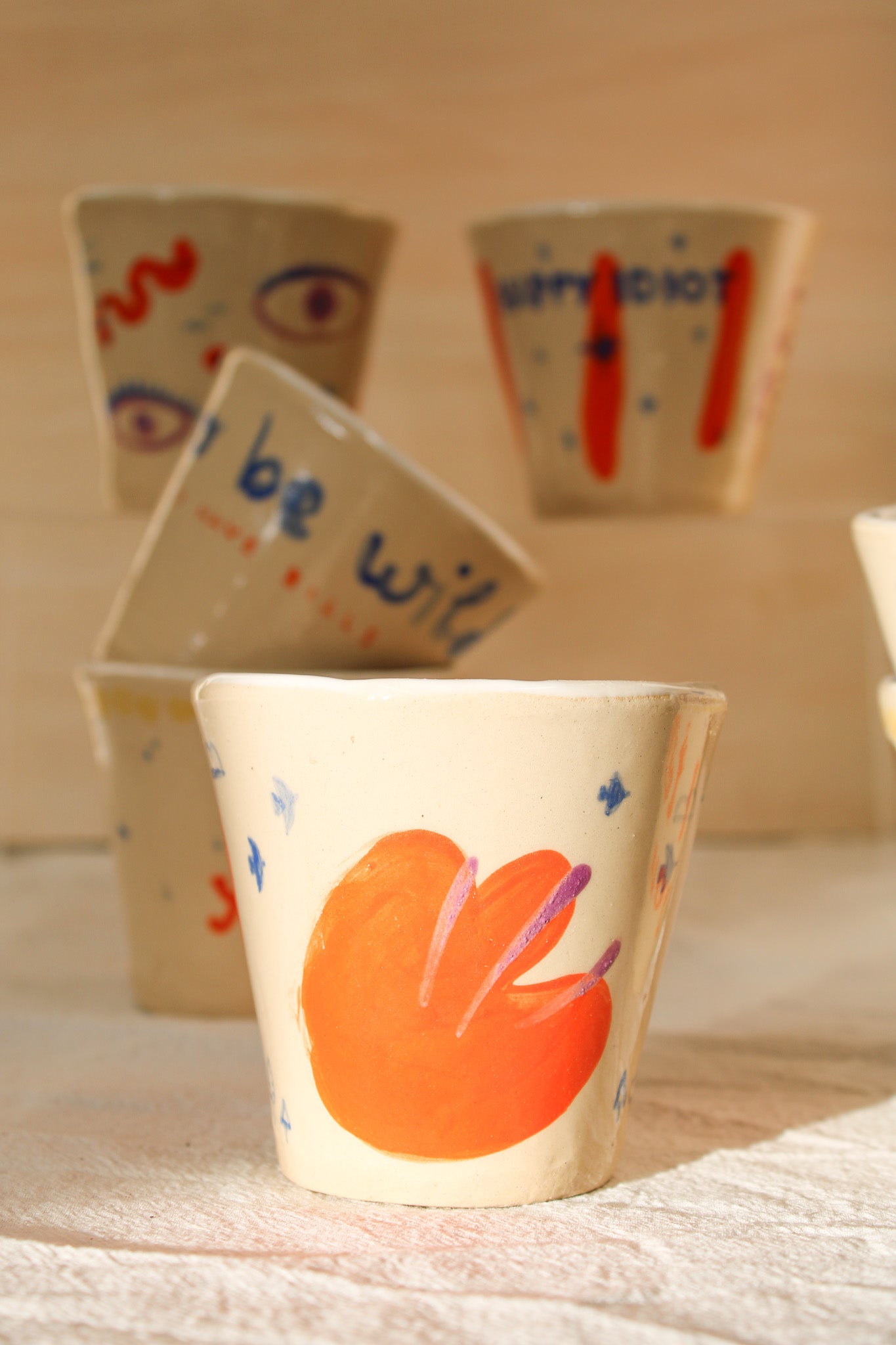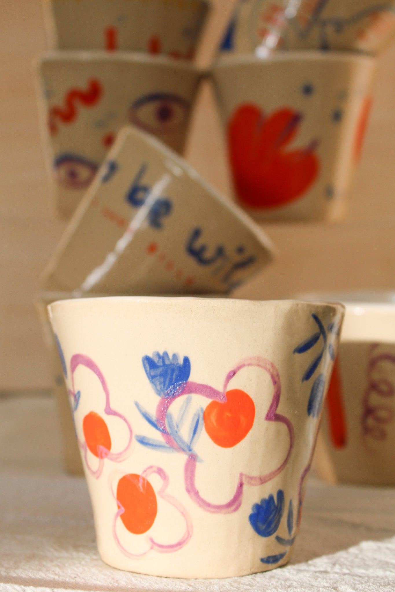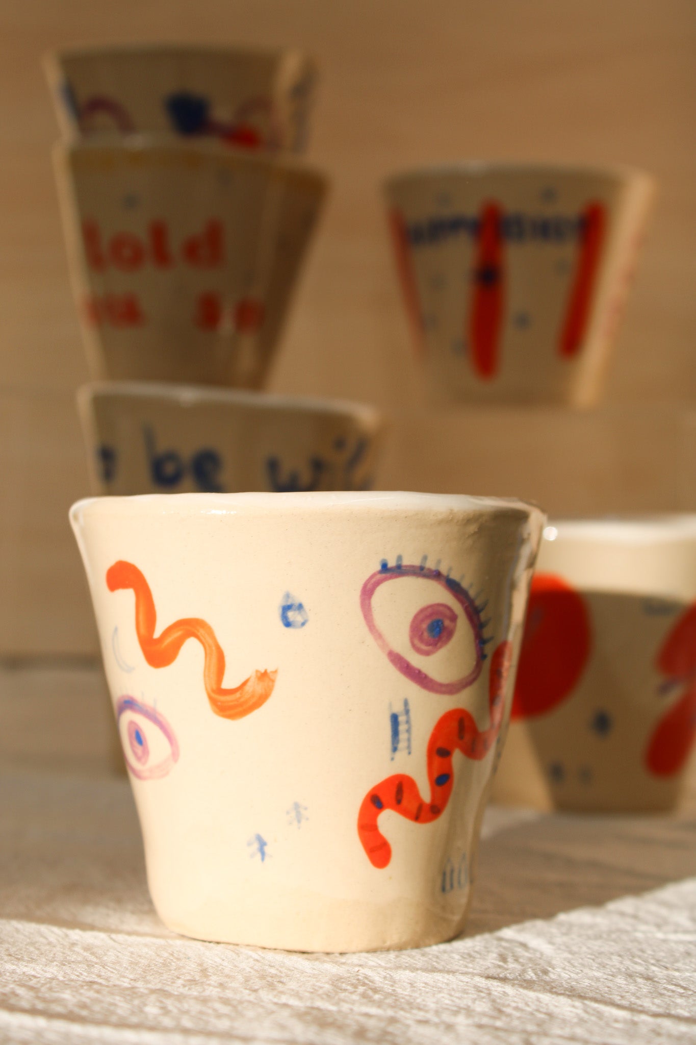 Handbemalte, in Platten-Technik gebaute Tassen, ohne Henkel.