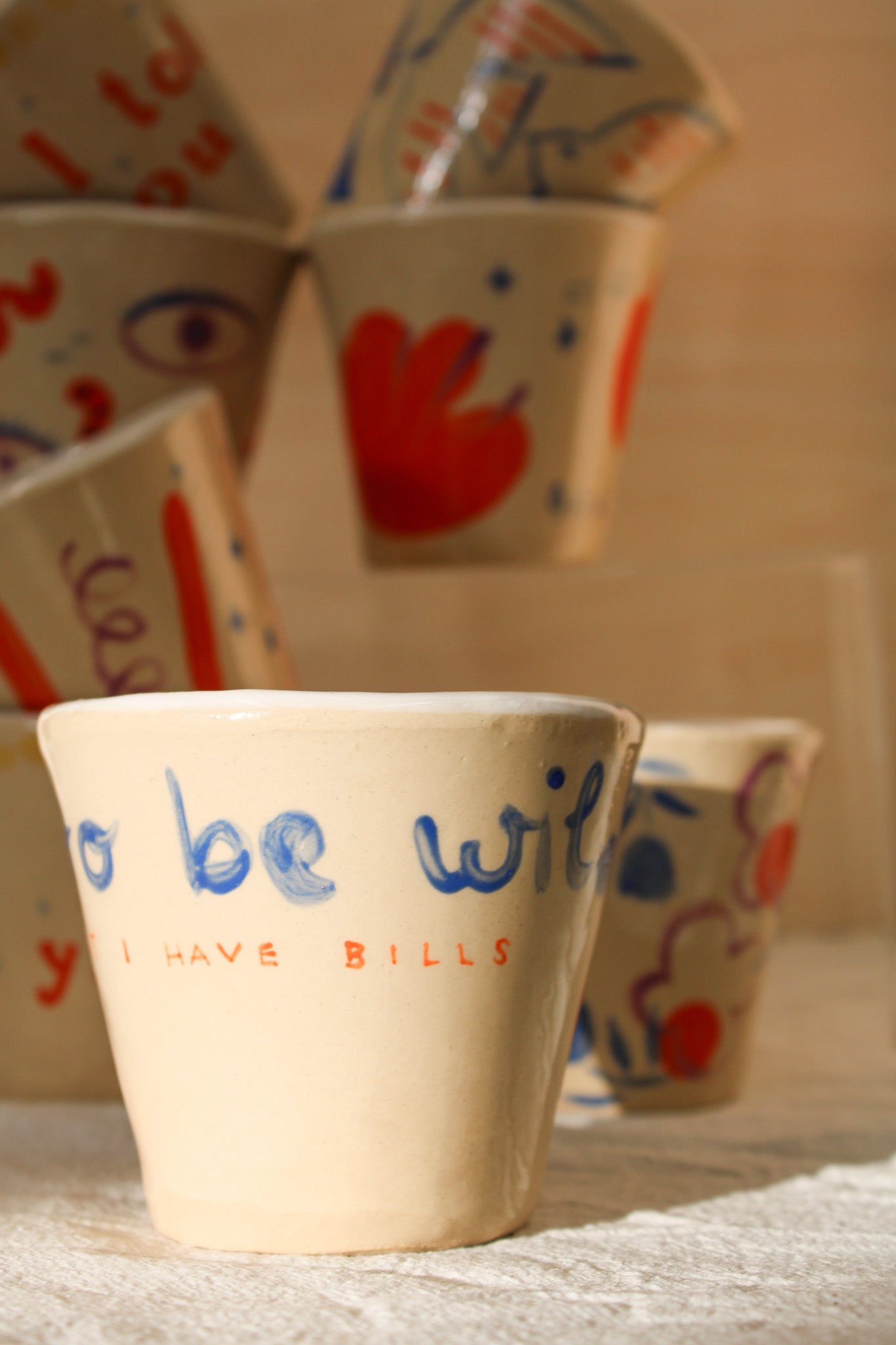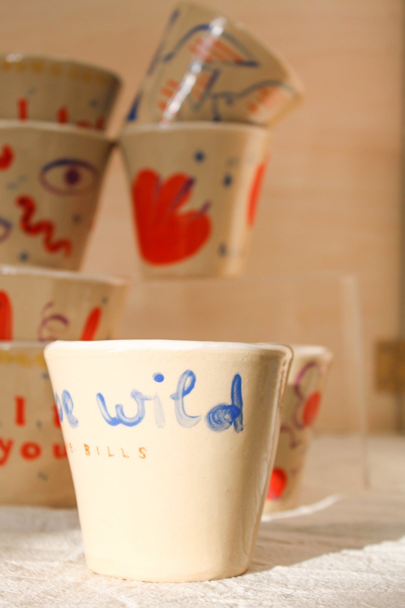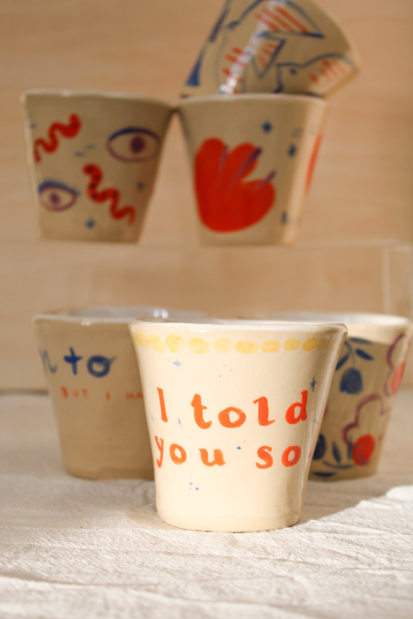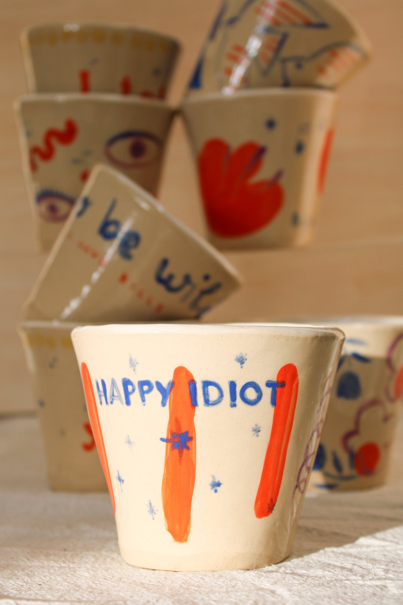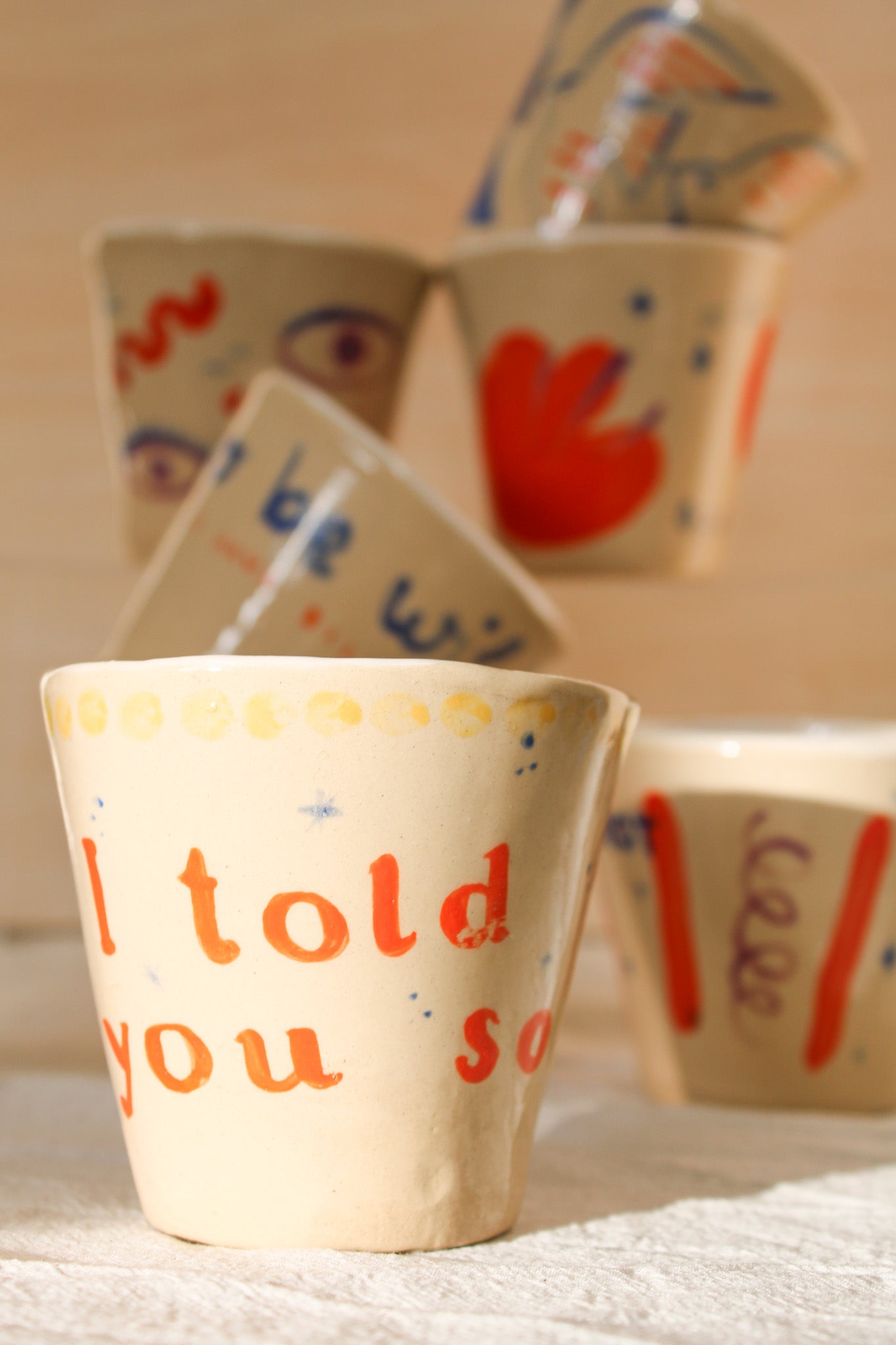 Handbemalte, in Platten-Technik gebaute Tassen, ohne Henkel.